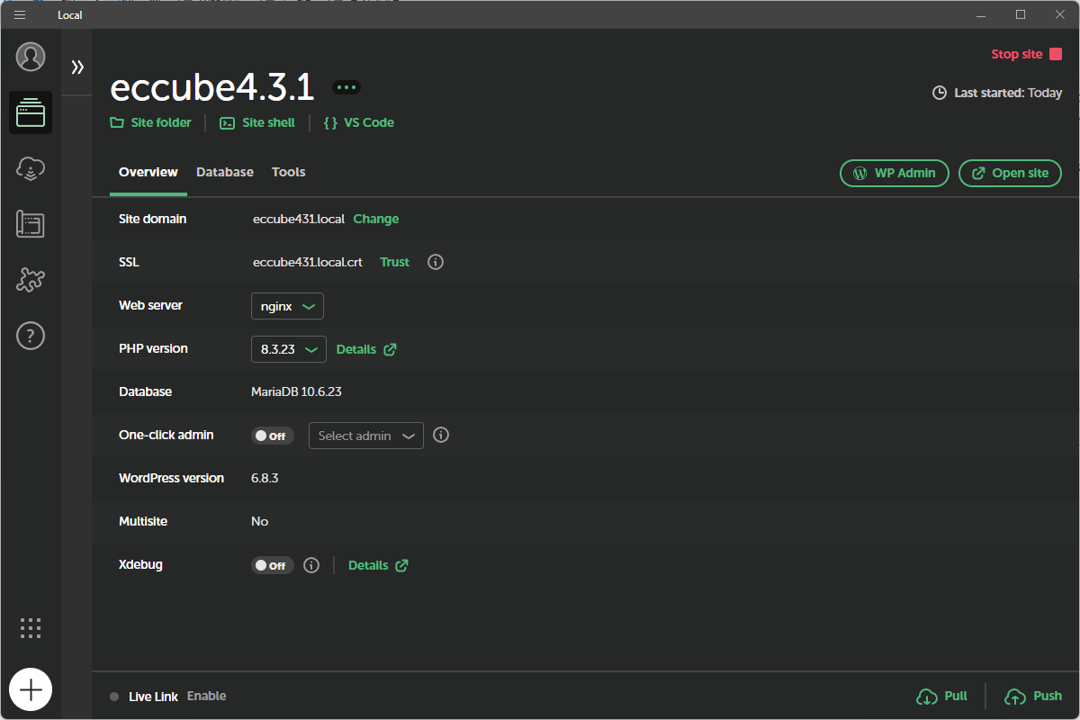 LocalはWordPress用の開発環境ソフトですが、PHPとデータベースがあるのでEC-CUBEを動かすことも可能です。