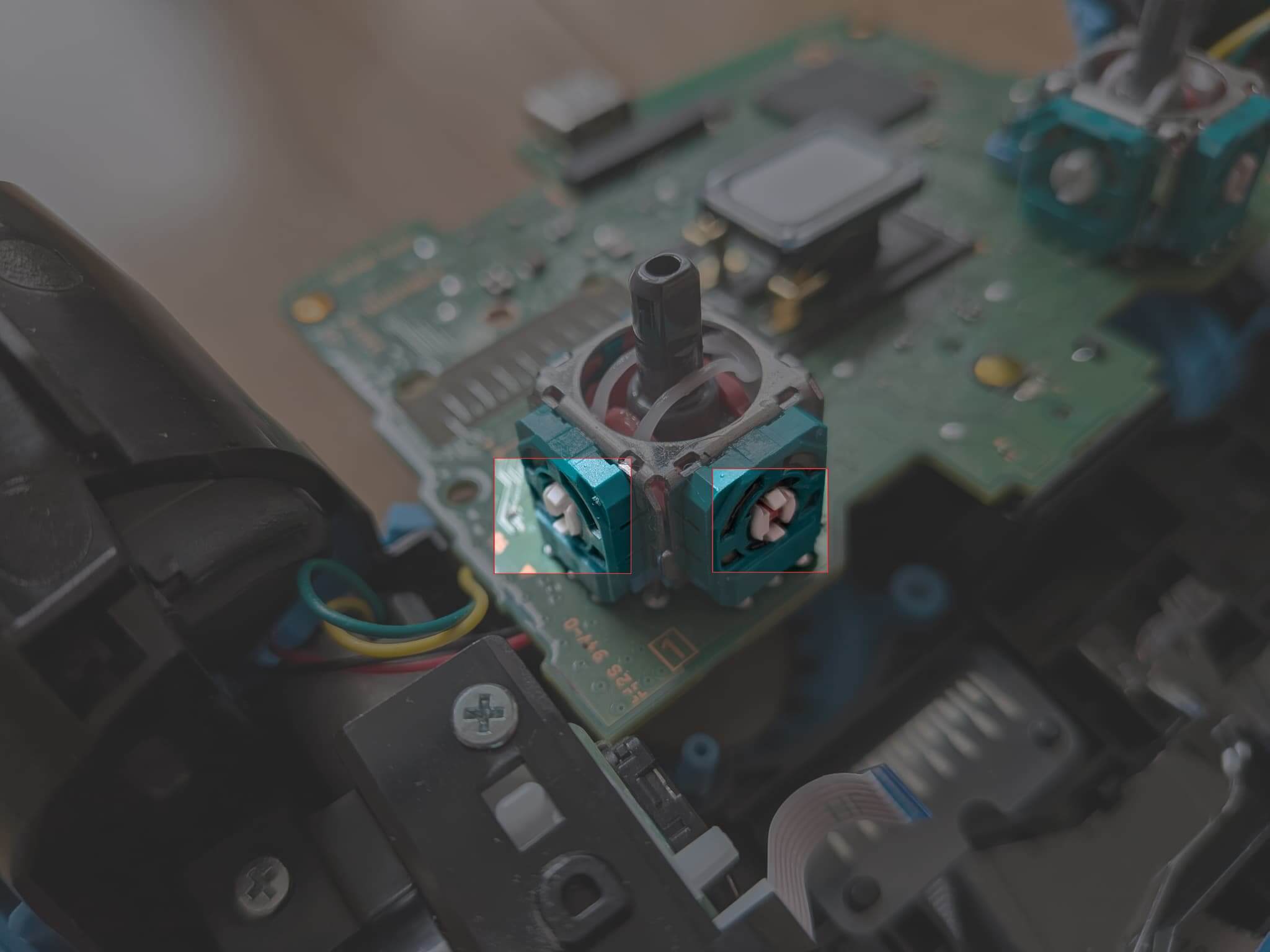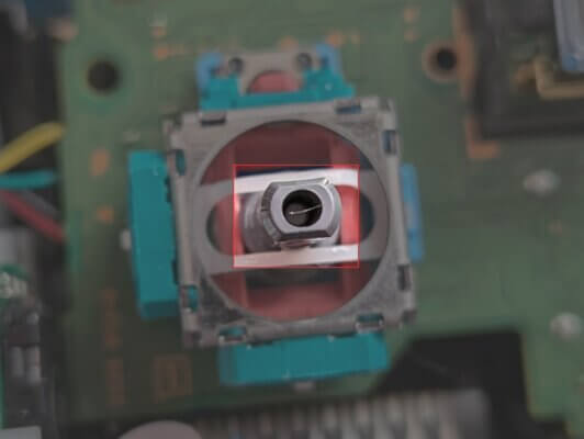 下記の箇所がスティックセンサーです。ほこりを取り除いたら、スティックセンサーに接点復活剤を吹き付けます。スティックをグリグリしてなじませましょう。