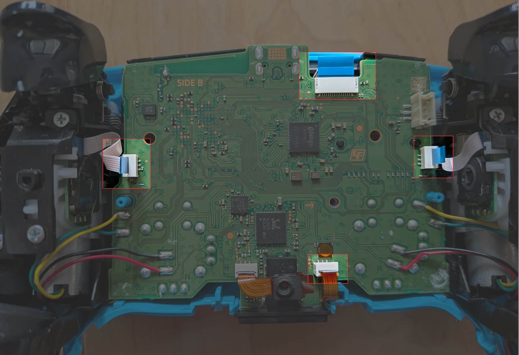 基盤からフレキシブルケーブルを引き抜きます。下記4箇所ありますので、それぞれ引き抜いてください。指で引き抜こうとすると結構固いので、ラジオペンチやピンセットを使って引き抜きます。私は普通のペンチで引き抜きました。