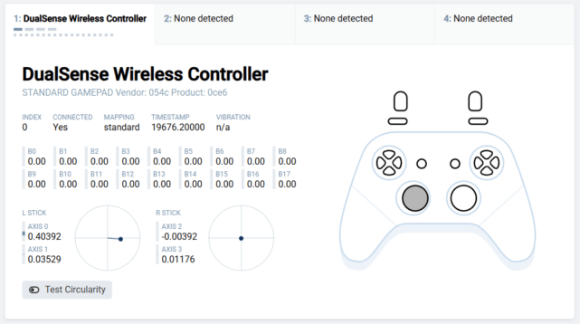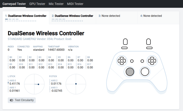 まずはコントローラーの状態を確認しましょう。Gamepad Testerを使ってドリフトしているかチェックします。