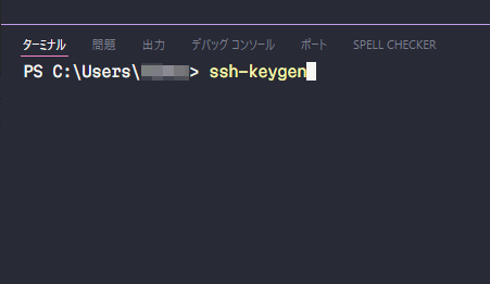 VSCodeの[ターミナル] -> [新しいターミナル]でターミナル画面を開きます。そこで「ssh-keygen」を実行します。