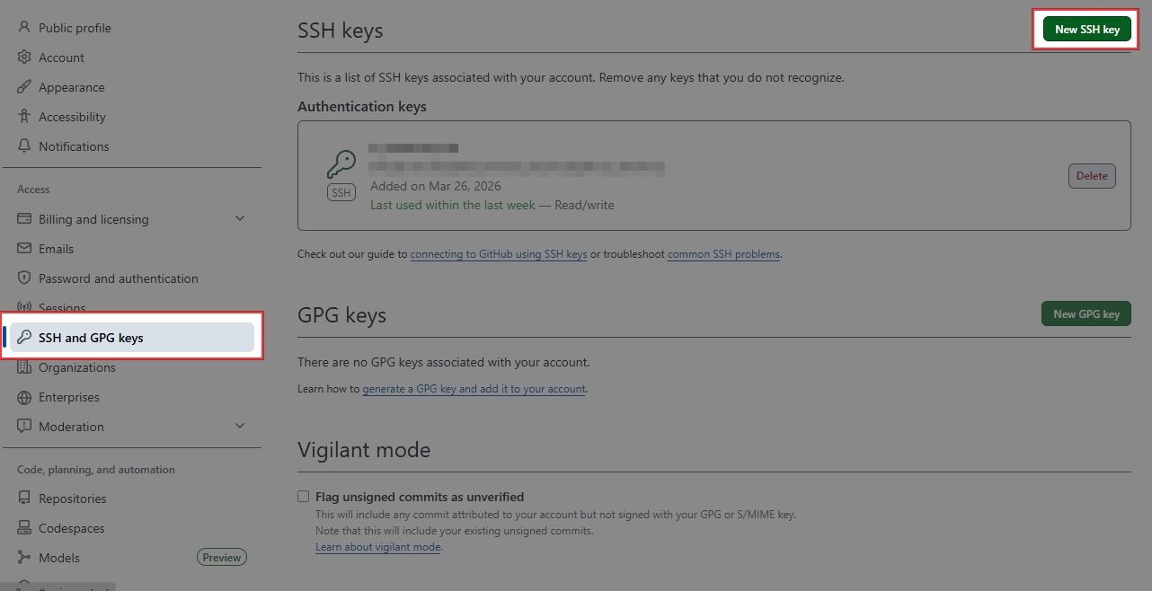 GitHubの[Settings] -> [SSH and GPG keys]を開いて、[New SSH key]をクリックします。