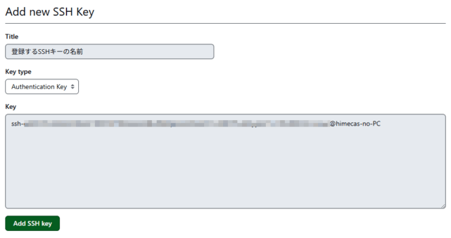 Titleにはわかりやすい名前を入れて、Keyに「id_〇〇.pub」の内容をそのまま貼り付けて保存します。Key typeは”Authentication Key”のままでOKです。