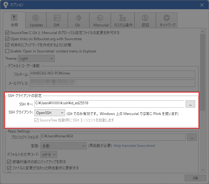 まずは、SourceTreeの[ツール] -> [オプション] -> [全般]で”SSHキー”と”SSHクライアント”を設定します。SSHキーは、「C:\Users\ユーザー名.ssh」に生成された「id_〇〇」という.pubではない方のファイルを指定します。SSHクライアントはOpenSSHに変更します。
