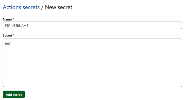 例えば、FTPユーザー名が「test」の場合、Nameには”FTP_USERNAME”、Secretには”test”と入力します。