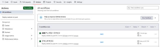 GitHubで該当リポジトリから[Actions]タブを開くと、以下のように自動アップロードが実行されたのが確認できます。実際にサーバー上にファイルがアップロードされているかもご確認ください。