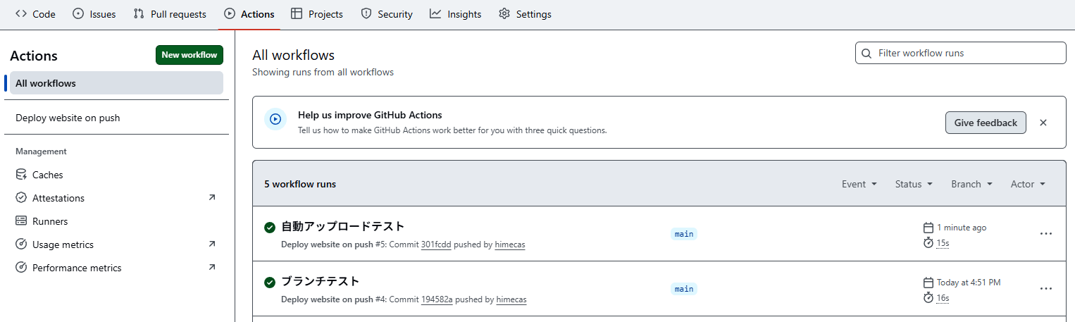 これ以降はコミットがmainブランチにプッシュされる度に、自動でサーバーにファイルがアップロードされるようになります。