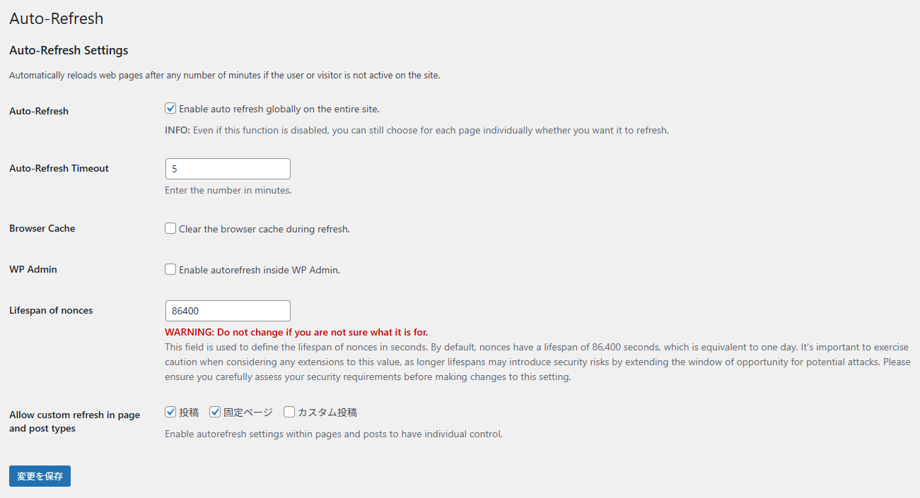 | Allow custom refresh in page and post types | 自動リロードする投稿タイプ |
